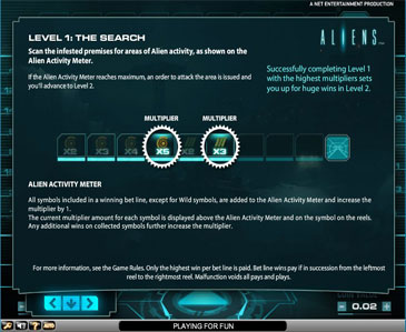Алиенс за деньги имеет весьма интересный и захватывающий сюжет. Перед тем как начать игру необходимо активировать линии и сделать ставку. После чего можно смело крутить барабаны и получать не плохие деньги. Вы можете поставить как на несколько линий, так и на все пятнадцать.
