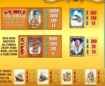 Принимается не больше 200 кредитов на линию. Монеты начисляются за комплекты одинаковых картинок, выпавших на активных позициях. Выигрыш зависит количества использованных полос (выбираются по схеме 1-5-9-15-21) и коэффициента попавшейся комбинации. В аппарате Around the World задействовано много интересных символов: изображения известных мировых достопримечательностей, способом передвижения и атрибутов путешественников. Оплачиваются они по-разному, но самый дорогой символ – это дерзкий англичанин, за которого дают до х10000 ставок.