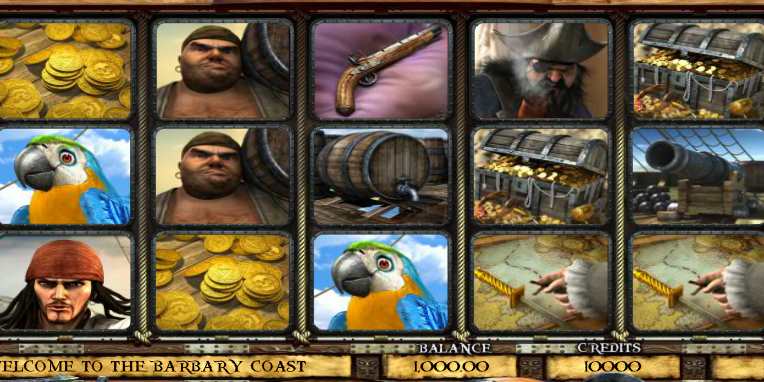 В игровом автомате Barbary Coast (Пиратский Берег) невероятно атмосферные символы: бочка с ромом, корабельная пушка, карта сокровищ, компас, пистоль, золотые пиастры, клад с сокровищами, черная метка и девушка (максимум 1500 кредитов).