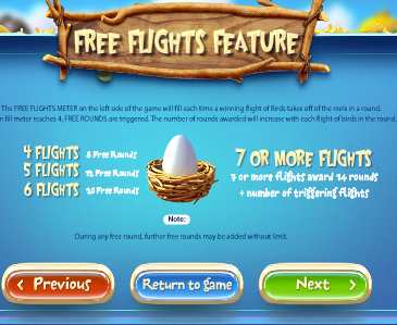 Еще одна особенность — при выпадении выигрышной комбинации птички улетают, а на их место прилетают другие. Это дает вам шанс выиграть повторно. И так много-много раз! Также сбоку есть шкала «Свободного полета» (Free Flights). Благодаря выигрышным комбинациям шкала заполняется, и когда она переполнится, вы сможете получить от 8 до 14 фриспинов!