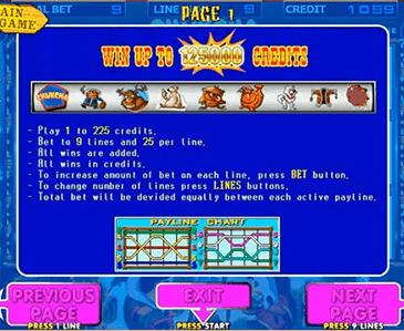 Слот располагает пятью барабанами, ставки принимаются на нечетное количество линий (всего их девять). На спин выходит не более 225 кредитов (до 25 на линию). По итогам раунда, если на активных полосах остановилось три и более одинаковых изображения, начисляется выплата – коэффициент комбинации (до х10000), умноженный на ставку. Все картинки должны оказаться рядом, начиная с левого столбика – иначе учитываться не будут.