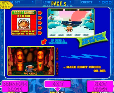 Символы онлайн аппарата Чукча – это северные животные, тамбурин, шуба, фирменный логотип. Таких спецсимволов, как в автомате Эволюция, нет. Бонусами выступают геолог и сам чукча – их тройное появление запускает призовые игры. Нажав на геолога, можно узнать размер призовой выплаты, а представитель коренного народа активирует бонусный раунд. На первом уровне придется выбирать полынью, а на втором – каменного идола в ритуальной пещере.