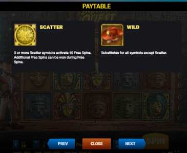 Буква «I» в левом нижнем углу открывает справочное меню с необходимой информацией и значениями выплат, отображающихся в виде множителей ставки. Тематика модели напоминает автомат Gonzo’s Quest.