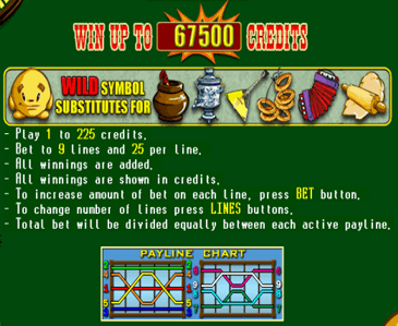 Пять барабанов и девять линий выплат – вот что предлагают нам производители. До запуска спина необходимо проставить количество линий (нечетное) и определиться со ставками (до 25 кредитов). Прибыльными будут комбинации из трех-пяти одинаковых картинок, что начинаются справа или слева от крайних барабанов. Конечно, эти последовательности оплачиваются по-разному (максимальный коэффициент х5000).