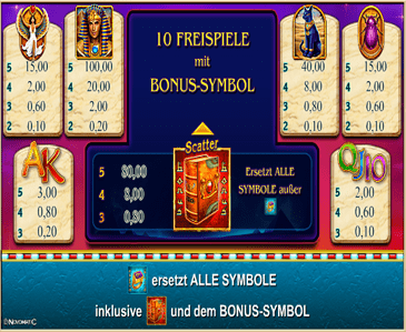 Аппарат Кольцо Фараона за деньги обладает пятью барабанами и тремя игровыми линиями. По концепции напоминает игровой автомат Книга Ра. Символика полностью соответствует тематике, но есть и уникальные изображения. Книга с глазом Ра вместила в себя функции дикого символа и разброса, в зависимости от выпавшей комбинации он играет роль то одного, то другого.