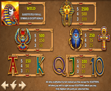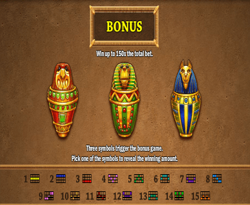 Особыми символами являются Wild (божество с головой сокола) и Bonus (урна с прахом). «Дикий» символ занимает крайние катушки – если это случится одновременно, активируются 15 фриспинов; еще он заменяет базовые изображения в комбинациях. Бонусы «ловятся» в средних колонках, их появление дает право на бонусную игру.