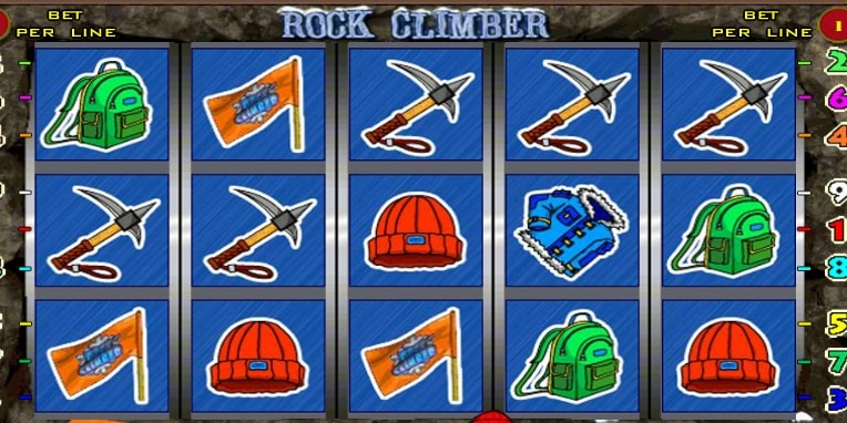 Игровой аппарат Скалолаз может похвастаться 5 барабанами и 9 линиями для выигрыша. Перед началом вращений необходимо указать размер ставки на каждую из полос (до 25 кредитов). Делается это с помощью кнопки Bet One, расположенной в нижней части аппарата. Там же находятся и остальные элементы управления.