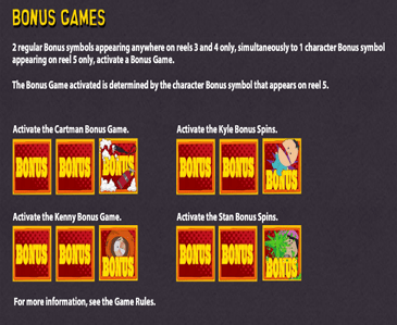 Играть увлекательно и весело, как в слот Обезьянки. Пользователь имеет возможность делать ставки на 25 линиях и пяти барабанах, на которых младшими символами считаются разные игральные карты, а старшими всем известные персонажи мультфильма: Кенни, Картман, Кайл и Стэн.